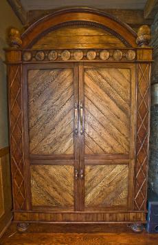 | Rustic Retreat Armoire in wormy chestnut & reclaimed oak with hand-carved finials & pulls |