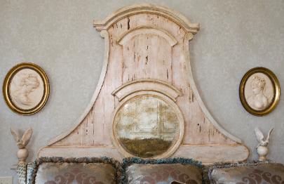 | French Quarters Headboard in a lime-washed pecky cypress finish with antique glass and hand-carved doves |